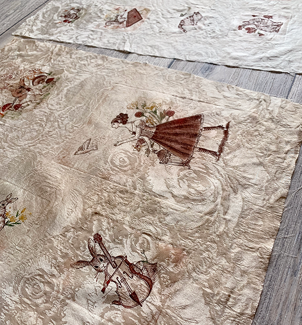 刷っているシルクは、紅茶染しています。染める色は濃かったり薄かったり。ムラが出るのも大歓迎!